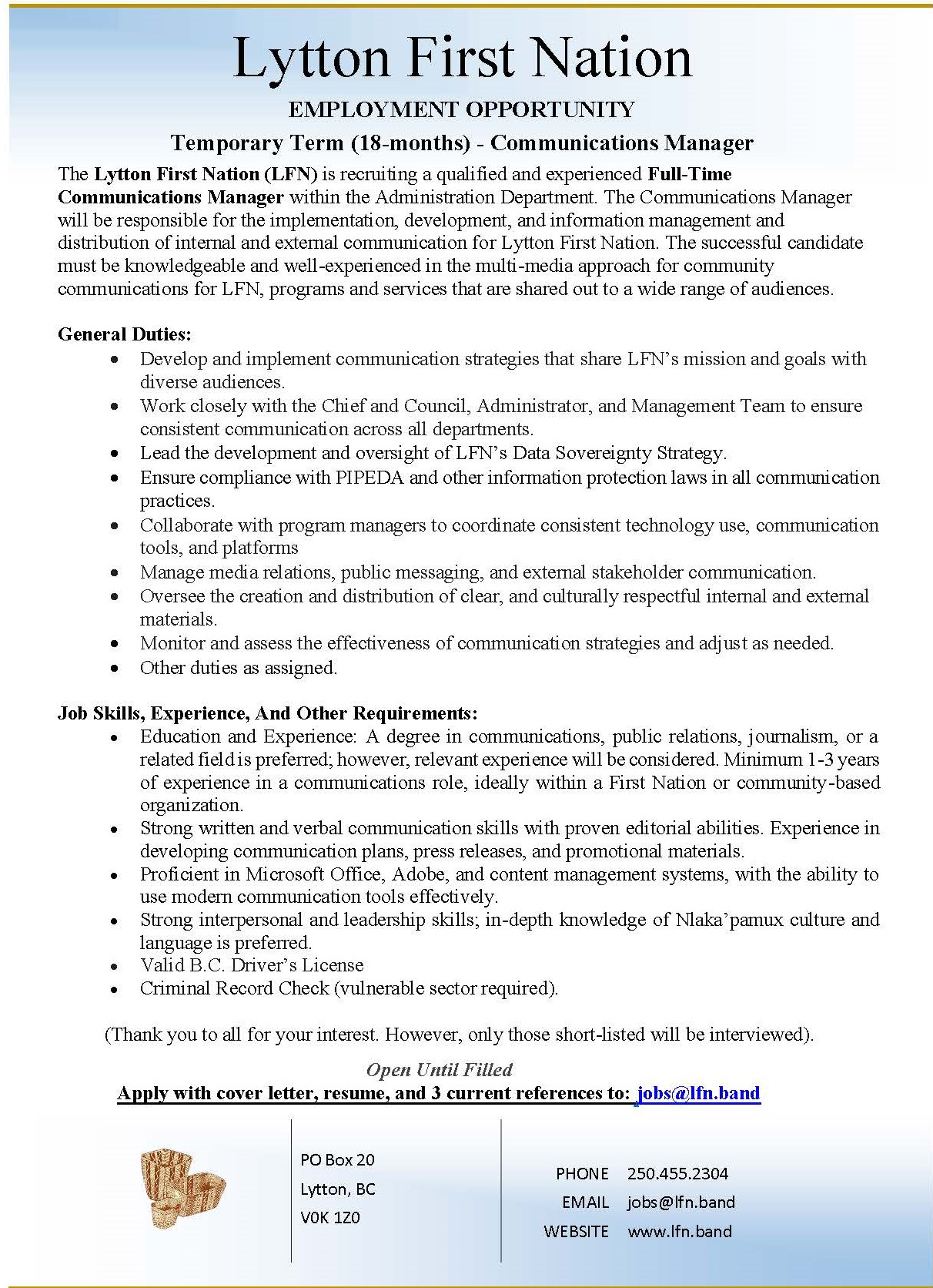 The Lytton First Nation (LFN) is recruiting a qualified and experienced Full-Time Communications Manager within the Administration Department. The Communications Manager will be responsible for the implementation, development, and information management and distribution of internal and external communication for Lytton First Nation. The successful candidate must be knowledgeable and well-experienced in the multi-media approach for community communications for LFN, programs and services that are shared out to a wide range of audiences.